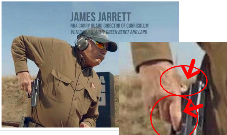 Please note, in defense of James Jarrett (pictured above) he has had his entire hand reconstructed around the gun due to a grenade accident, but non-the-less why would anyone, especially Ackerman-McQueen* select this image and others to promote a program such as Carry Guard.